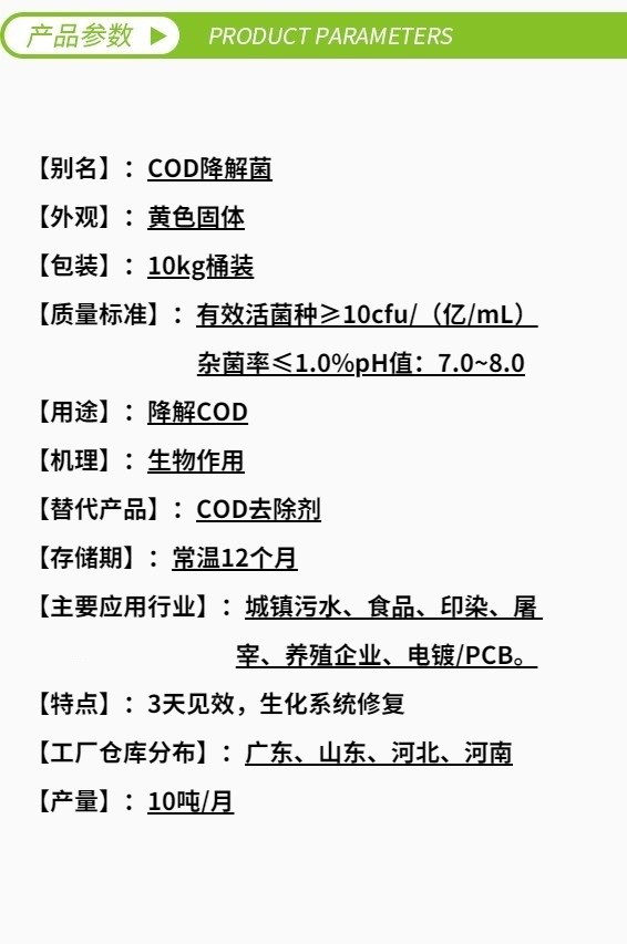 庫(kù)巴魯®COD激活菌301是針對(duì)生化系統(tǒng)中COD專門研發(fā)的高效COD去除菌,能降解廢水中的蛋白質(zhì)、淀粉、纖維素、糖類、油脂等碳?xì)浠衔铮嵘齼?yōu)勢(shì)菌群,有效抑制病原性微生物的繁殖。推薦閱讀:《滲濾液COD去除劑—清源牌》