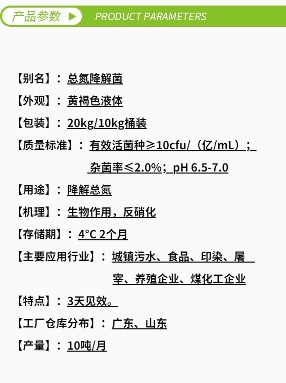 總氮激活菌101是針對生化系統(tǒng)中高濃度總氮廢水而專門研發(fā)的高效反硝化菌,能高效降解廢水中的硝態(tài)氮、亞硝態(tài)氮等氮化合物,可在各種復雜廢水中與其它產(chǎn)品配合使用。