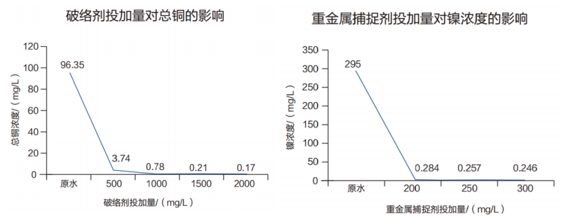 2.通過我司投加一系列配套藥劑后,達(dá)到如下效果在破絡(luò)劑投加量為1500mg/L,重金屬捕捉劑投加量為300mg/L時(shí),出水總銅降至0.21mg/L、總鎳降至0.246mg/L、總磷穩(wěn)定在1.0mg/L、總氮穩(wěn)定在15mg/L;